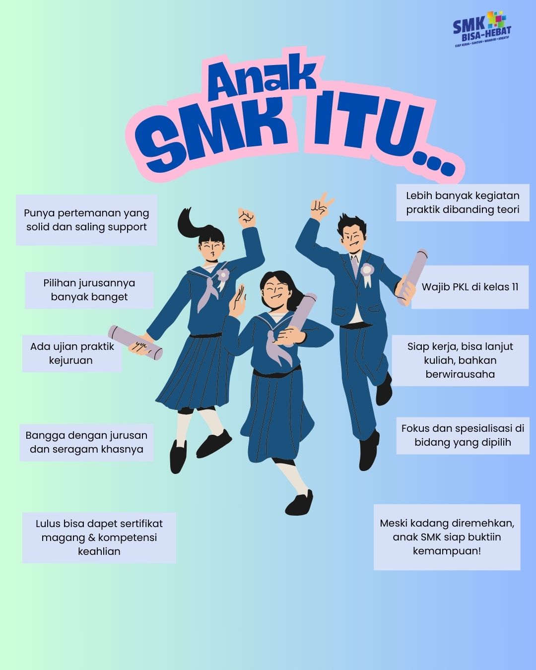 SMK bukan hanya tempat belajar teori, tapi juga wadah untuk mengembangkan keterampilan, karakter, dan kesiapan menghadapi dunia kerja. Di SMK IPTEK JAKARTA, para siswa tidak hanya dibekali ilmu, tetapi juga pengalaman nyata yang berguna di masa depan. Berikut beberapa hal yang bikin bangga jadi anak SMK: 1. Pertemanan yang solid dan suportif Suasana kekeluargaan antar siswa menjadikan proses belajar lebih menyenangkan dan saling mendukung. 2. Pilihan jurusan yang beragam Siswa bisa memilih jurusan sesuai minat dan bakat, dari teknologi hingga layanan kesehatan, desain, dan lainnya. 3. Ujian praktik kejuruan Evaluasi dilakukan tidak hanya lewat teori, tapi juga kemampuan praktik langsung di bidang keahlian. 4. Bangga dengan seragam dan jurusan Identitas sebagai siswa SMK menjadi sumber semangat dan kebanggaan. 5. Mendapat sertifikat magang dan kompetensi Lulusan SMK memiliki keunggulan tersendiri karena sudah mengantongi sertifikasi keahlian. 6. Lebih banyak praktik daripada teori Pendekatan pembelajaran berbasis praktik mempersiapkan siswa menghadapi dunia kerja secara langsung. 7. PKL (Praktek Kerja Lapangan) di kelas 11 Siswa terjun langsung ke dunia industri untuk belajar dari pengalaman nyata. 8. Siap kerja, lanjut kuliah, bahkan wirausaha Lulusan SMK memiliki banyak opsi setelah lulus, tak terbatas hanya satu jalur. 9. Spesialisasi sesuai minat Fokus pembelajaran sesuai jurusan menjadikan siswa lebih terampil dan profesional. 10. Siap buktikan kemampuan Meskipun kadang dipandang sebelah mata, siswa SMK siap menunjukkan bahwa mereka mampu bersaing dan unggul! SMK IPTEK JAKARTA terus berkomitmen membentuk siswa yang terampil, siap kerja, dan berdaya saing global. Karena itu, tak heran kalau jadi anak SMK adalah kebanggaan!